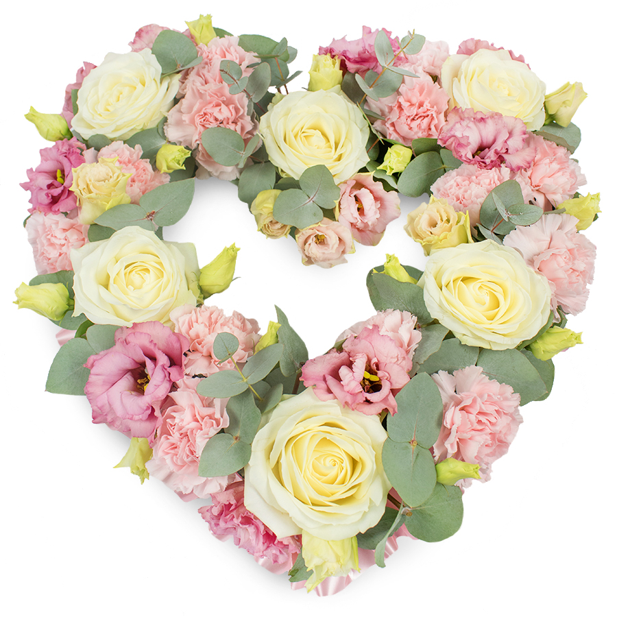 Honor your loved ones with our graceful remembrance bouquet, expertly arranged to convey your heartfelt sentiments. This elegant arrangement features a stunning combination of white roses, pink carnations, pink lisianthus, and eucalyptus, ensuring a unique and touching tribute.